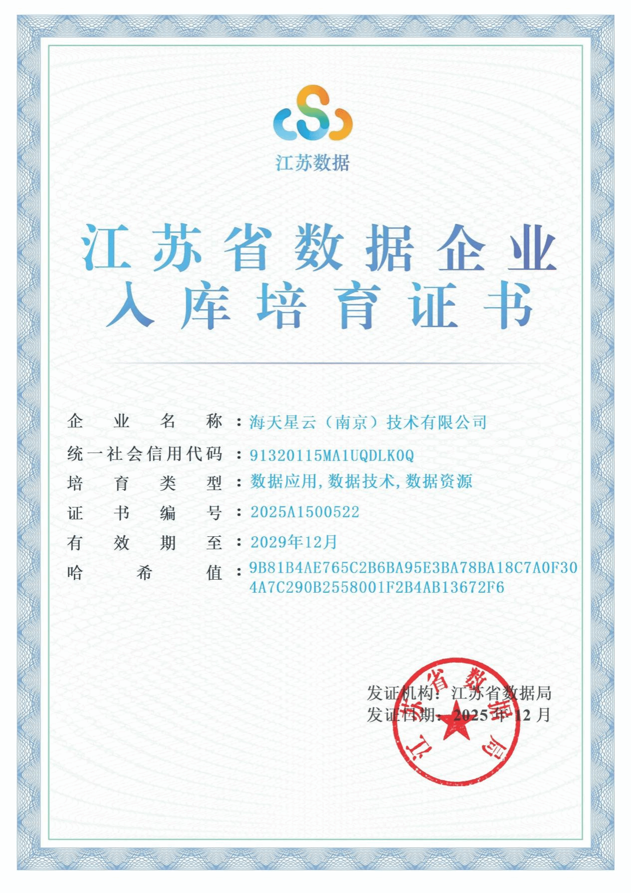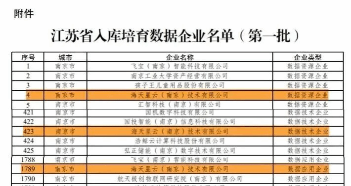 近日,江苏省数据局公布 2025 年度首批入库培育数据企业名单,我校科技园园区企业海天星云(南京)技术有限公司成功入选,并同时获评数据应用、数据技术、数据资源三大核心培育类企业,彰显综合实力。